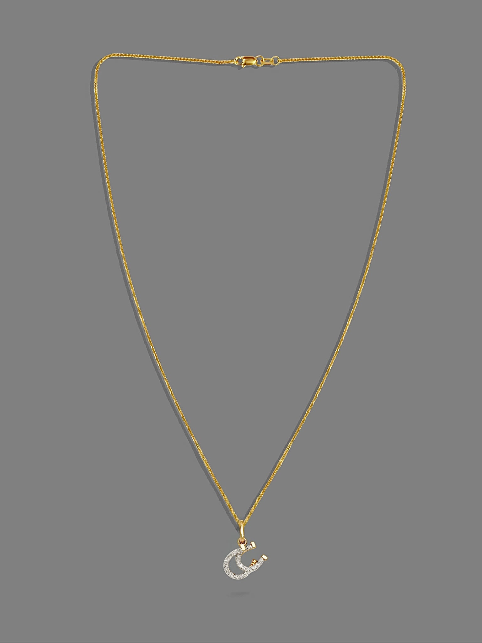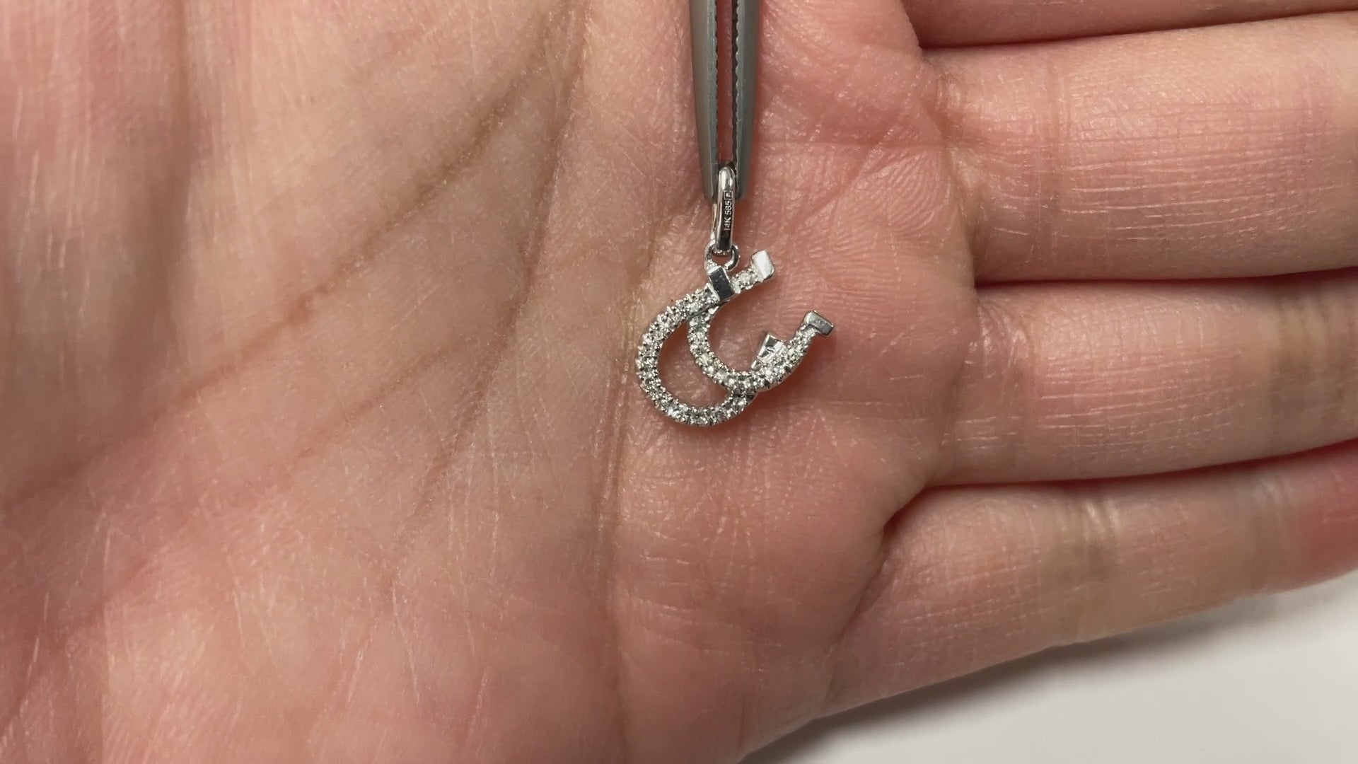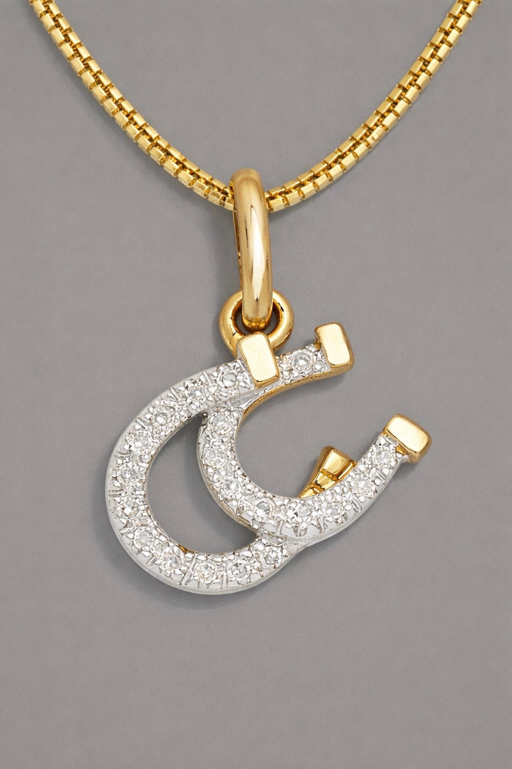 14k solid gold double diamond horseshoe pendant featuring 20 natural round cut diamonds.